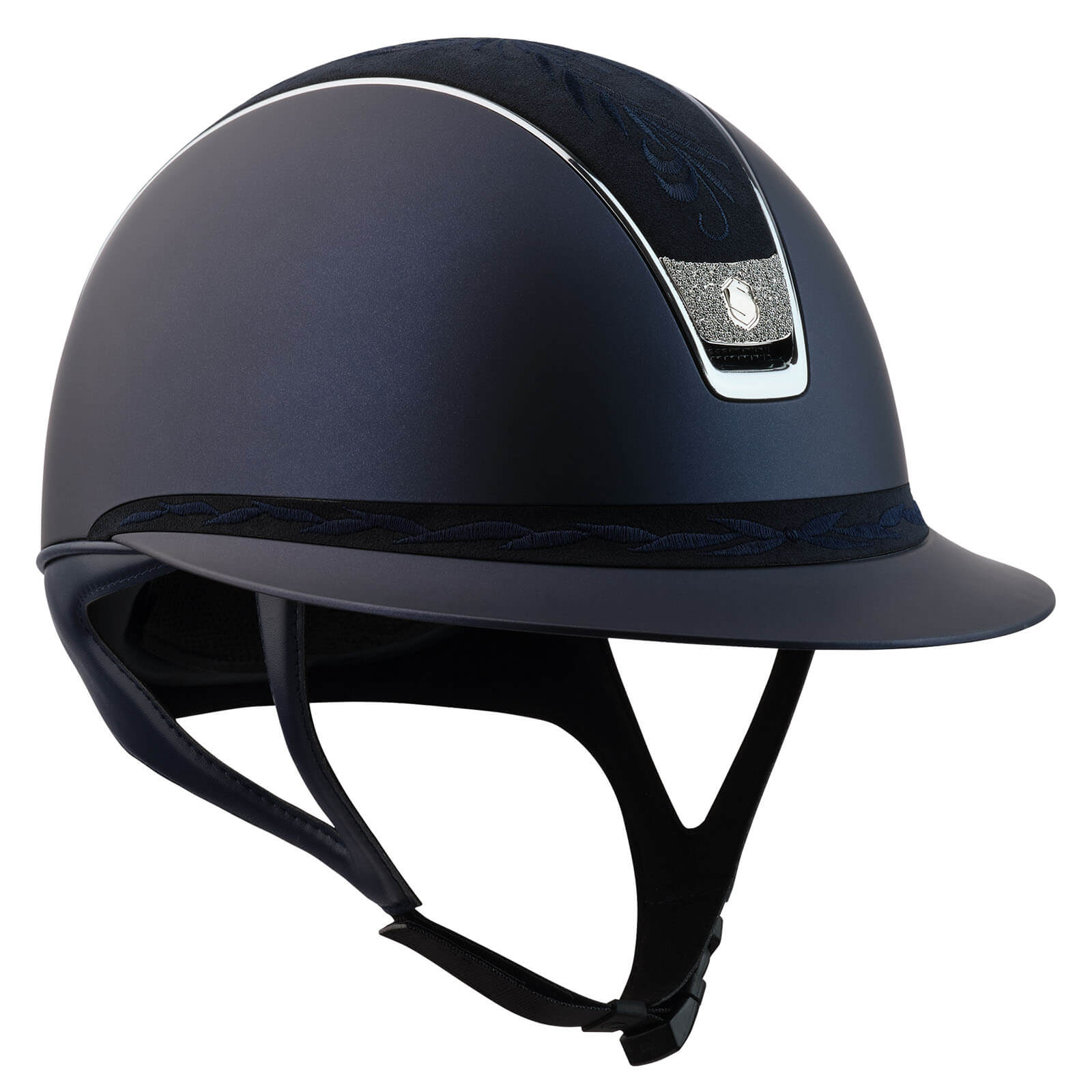 Der Miss Shield Shadowmatt 2.0 Blue Flower Embroidery beeindruckt mit seiner tiefblauen Farbe und den kunstvollen Blumenstickereien auf dem Top und dem Frontalband. Diese eleganten Details verleihen dem Helm nicht nur einen unverwechselbaren Look, sondern sorgen auch für eine klare Wiedererkennung im Stall oder auf dem Turnierplatz. Der Chrome-Trim verleiht dem Design einen zusätzlichen Hauch von Raffinesse.