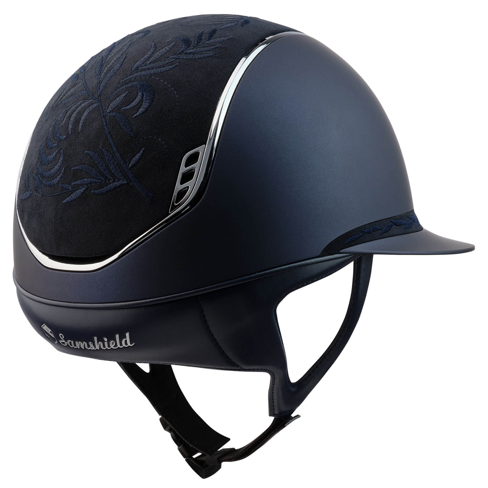 Reithelm Miss Shield Shadowmatt 2.0 Blue Flower Embroidery von Samshield kombiniert stilvolle Ästhetik mit höchster Sicherheit und Komfort. Mit einem eleganten Design, das durch florale Stickereien besticht, und modernster Schutztechnologie ist dieser Helm dein perfekter Begleiter im Sattel.