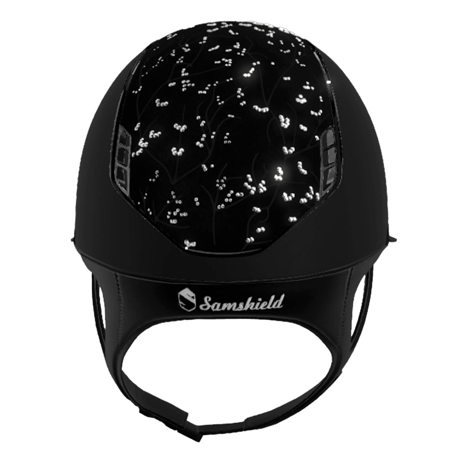 Reithelm 2.0 Black Shadowmatt Top Crystal Leaf Trim + Blason Black Chrome von Samshield kombiniert herausragendes Design mit höchster Sicherheit und Komfort. Dieser Reithelm ist die perfekte Wahl für anspruchsvolle Reiter, die auf der Suche nach einer individuellen Passform und exzellenter Belüftung sind.
