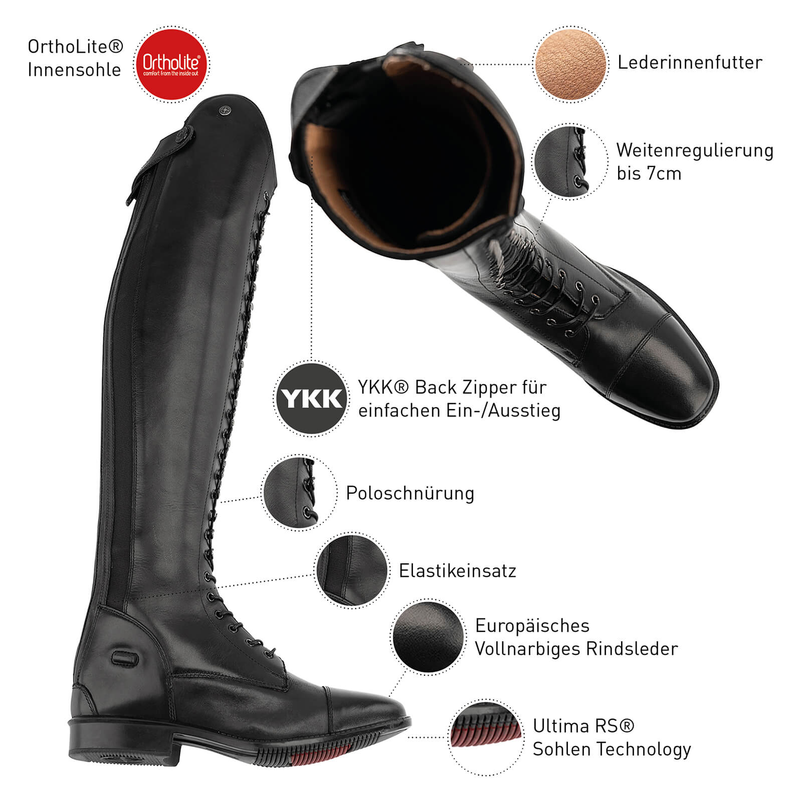 Der Reitstiefel Legacy Venado besticht durch sein klassisches Design und die edle Farbgebung in Braun und Schwarz. Der hohe Dressurbogen und die elastische Poloschnürung verleihen dem Stiefel nicht nur eine ansprechende Silhouette, sondern sorgen auch für eine exzellente Passform. Der Kareeleisten und die zahlreichen Schaftvarianten bieten dir die Möglichkeit, den Stiefel individuell auf deine Bedürfnisse abzustimmen.