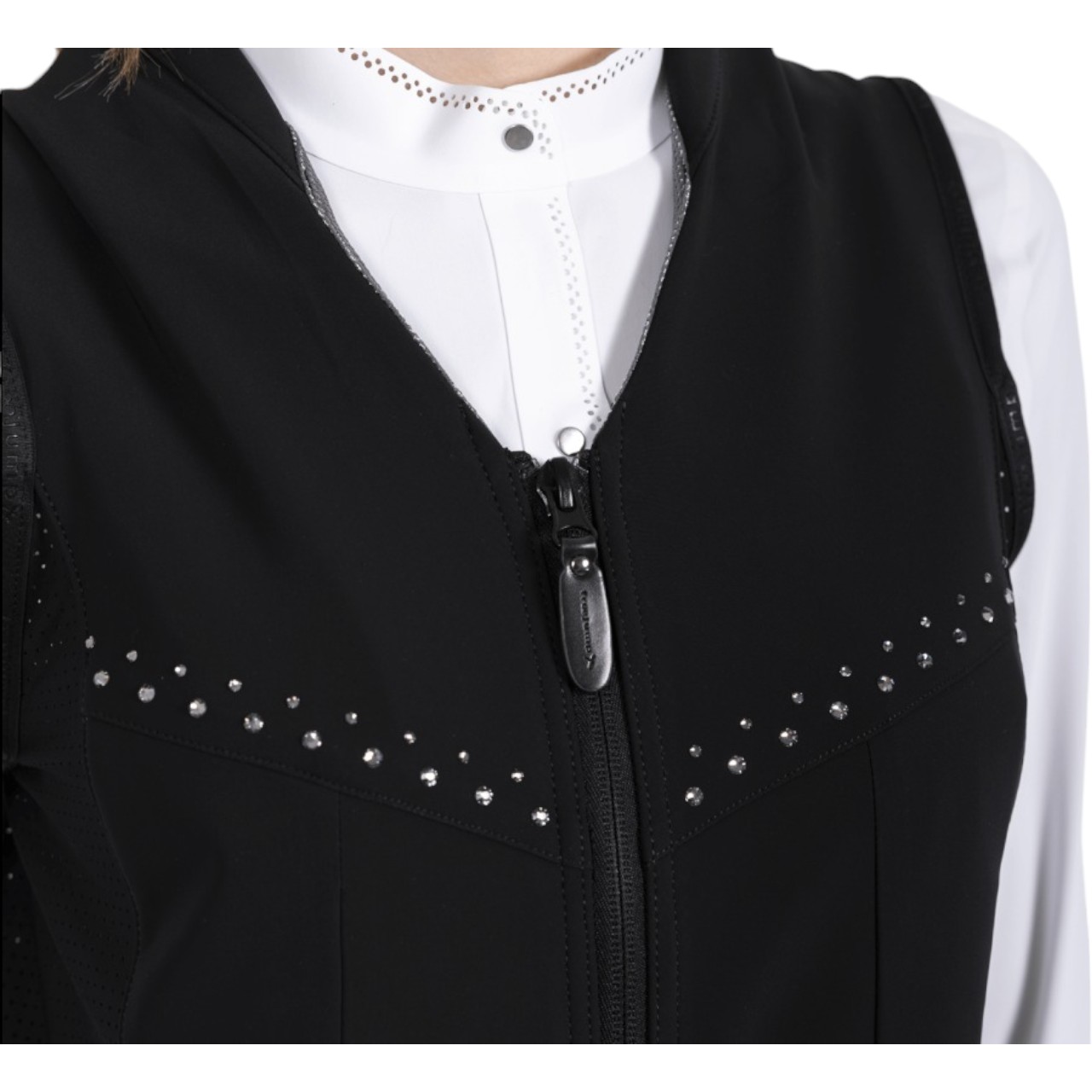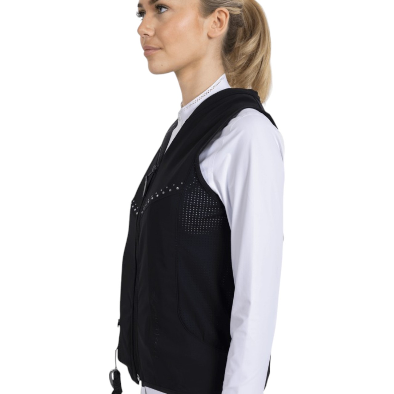 Die Weste ist aus hochwertigen, seidigen italienischen Stoffen gefertigt, die angenehm auf der Haut liegen und gleichzeitig atmungsaktiv sind. Perforierte Seiten sorgen für ein ausgezeichnetes Körperklima – auch bei intensiven Trainingseinheiten. Durch ihren flexiblen Schnitt passt sich die Sicherheitsweste optimal an deinen Körper an, ohne dich in der Bewegung einzuschränken. Die eleganten Kristallelemente auf der Brust verleihen ihr einen stilvollen Look. Zusätzlich verhindert eine spezielle Textilschlaufe am Sattelriemen störende Geräusche bei Kontakt mit dem Karabiner der Auslöseleine. Funktionalität und Stil verbinden sich hier zu einem Produkt, das keine Kompromisse eingeht.