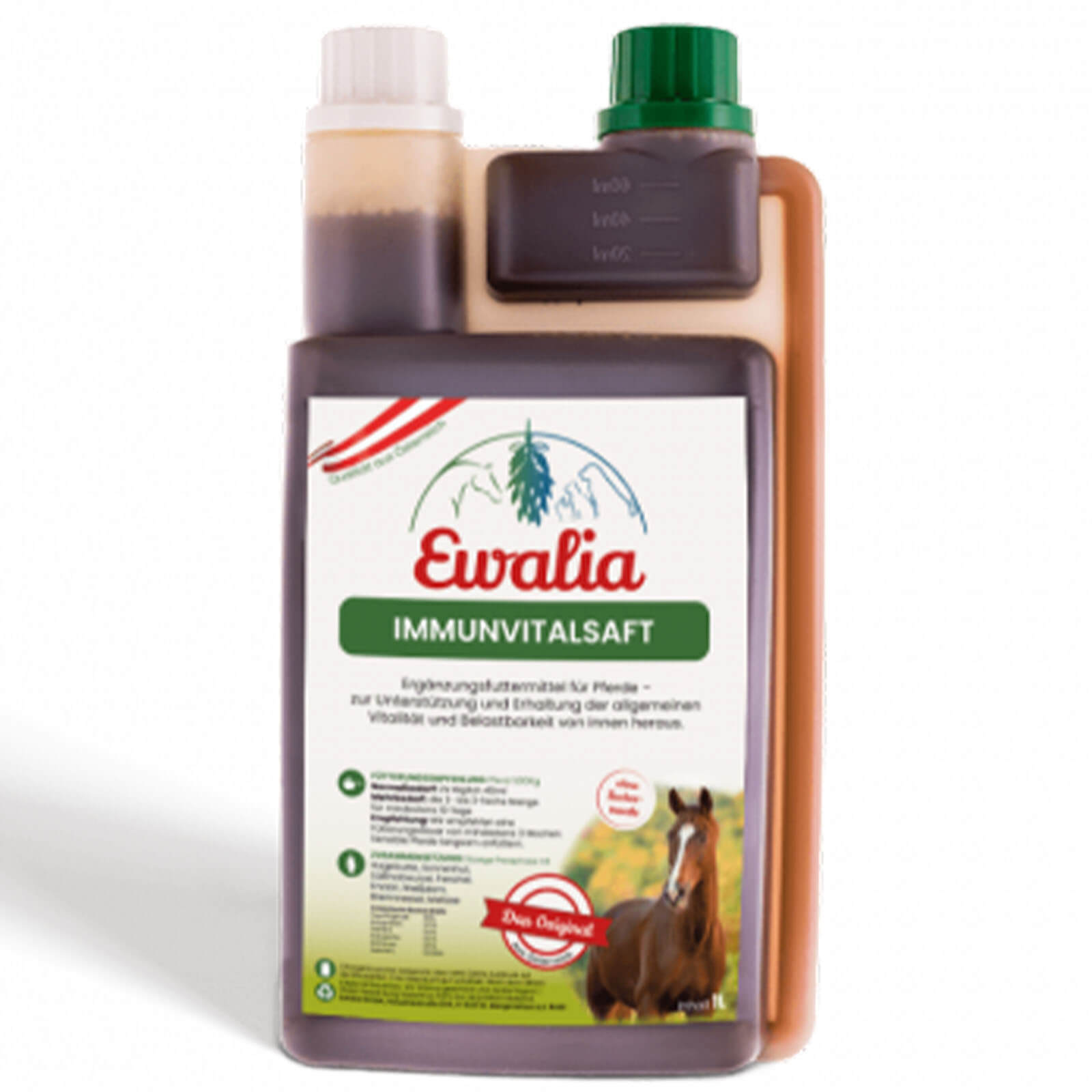 Ewalia Immunvitalsaft Ergänzungsfuttermittel bietet eine hochwertige Ergänzung für die tägliche Fütterung deines Pferdes. Erhältlich in praktischer 1-Liter-Flasche.