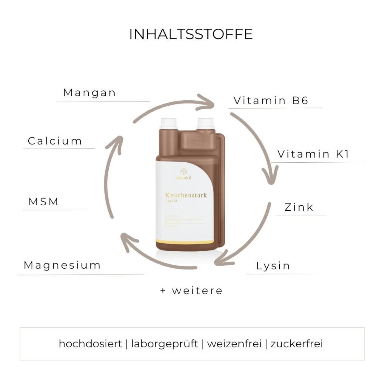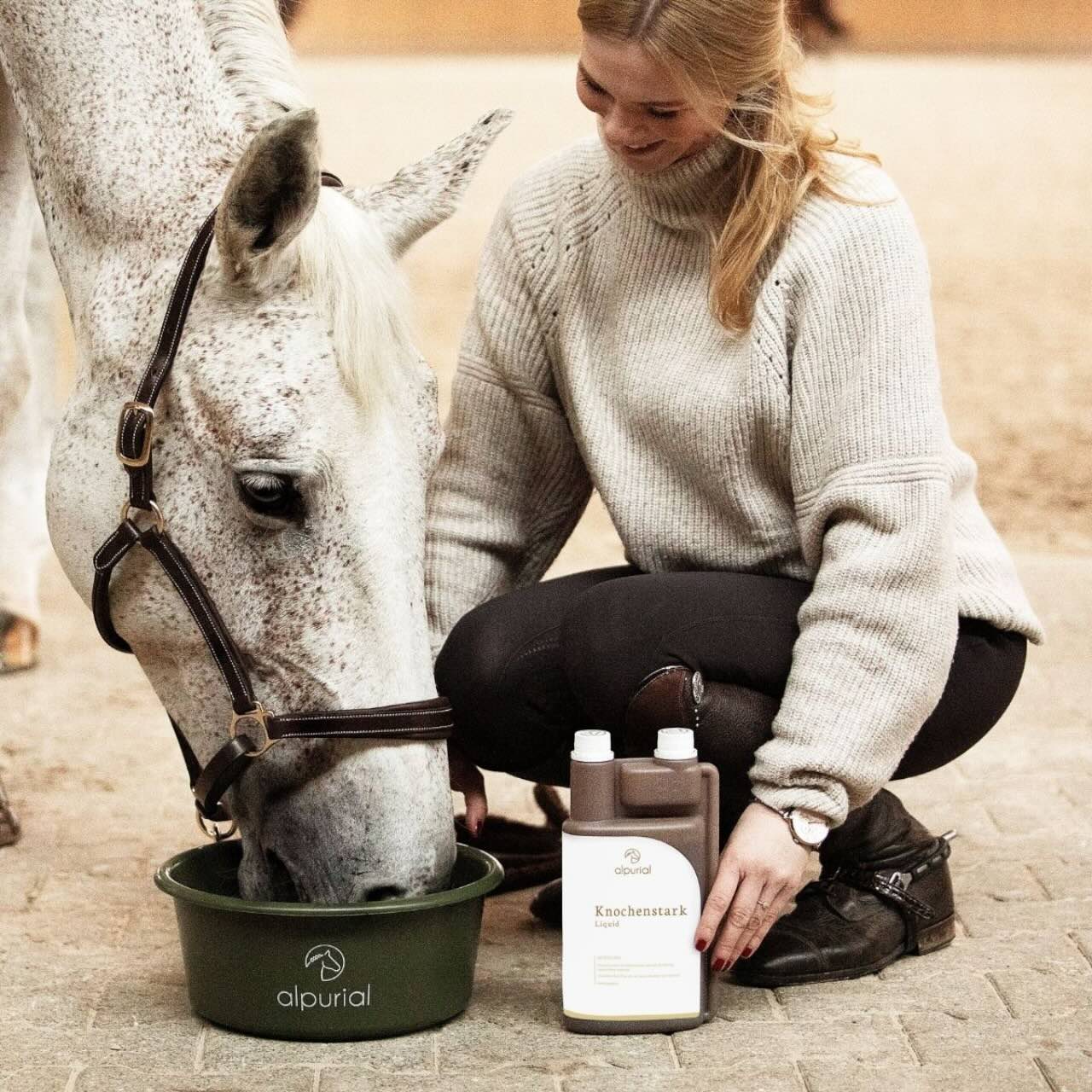 Knochenstark Zusatzfutter lässt sich einfach in die tägliche Fütterung integrieren. Die empfohlene Ration wird individuell an den Bedarf deines Pferdes angepasst. Die enthaltenen Inhaltsstoffe wie Calcium, Mangan und Vitamin K sind Bestandteil der ernährungsphysiologischen Versorgung. Gerade bei Pferden in Wachstums- oder Aufbauphasen kann eine bedarfsgerechte Ergänzung sinnvoll sein. Auch ältere Tiere oder Pferde mit besonderen Belastungen im Training profitieren von einer abgestimmten Nährstoffzufuhr. Die tägliche Gabe kann dazu beitragen, tragende Strukturen wie Knochen und Bindegewebe im Ernährungsplan zu berücksichtigen. So ergänzt Alpurial Knochenstark deinen Fütterungsalltag sinnvoll.