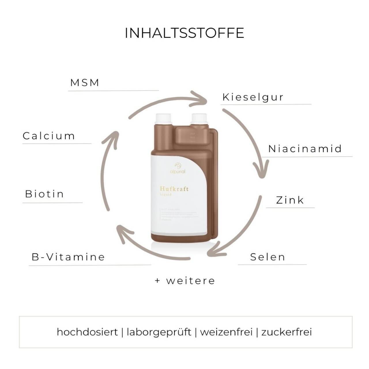 Die Zusammensetzung von Alpurial Huf Kraft Zusatzfutter basiert auf ausgewählten Mikronährstoffen, die sorgfältig aufeinander abgestimmt sind. Biotin wird häufig in Kombination mit MSM und Kieselgur ergänzt, um eine bedarfsgerechte Aufnahme zu unterstützen. Auch B-Vitamine sind enthalten, die zur Ergänzung einer ausgewogenen Ration beitragen können. Die flüssige Form ermöglicht eine einfache Dosierung und gute Mischbarkeit mit dem Krippenfutter. Durch die spezielle Formulierung ist das Produkt besonders alltagstauglich und praktisch in der Anwendung. Die wertige Zusammensetzung macht es zu einem geeigneten Bestandteil der Futterroutine für Pferde mit erhöhtem Bedarf.