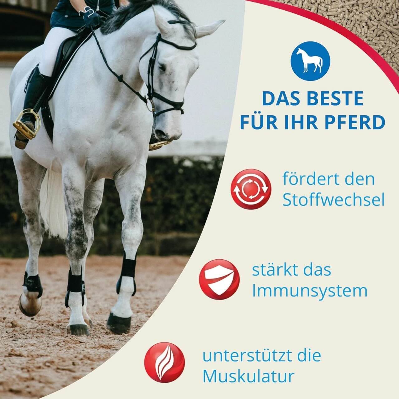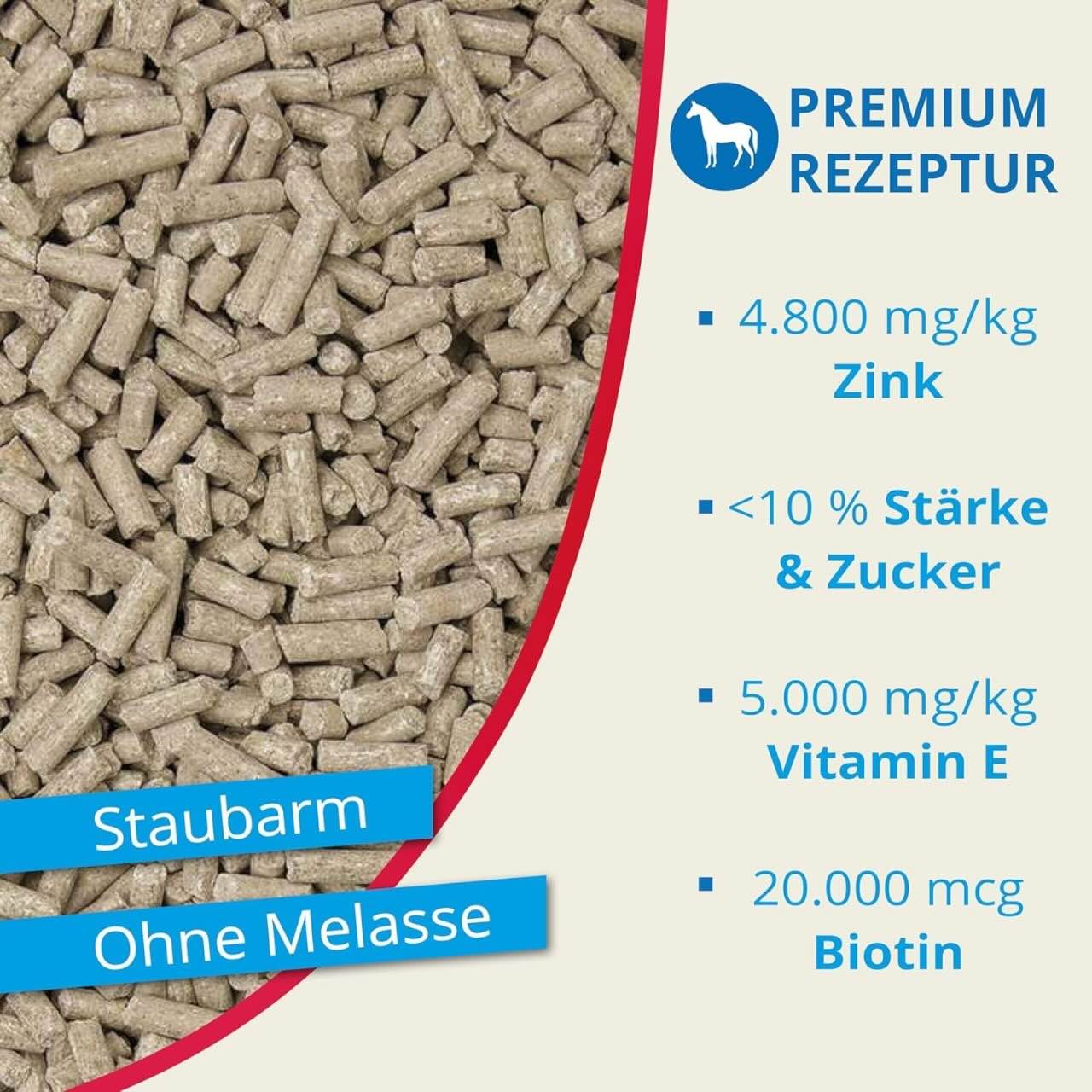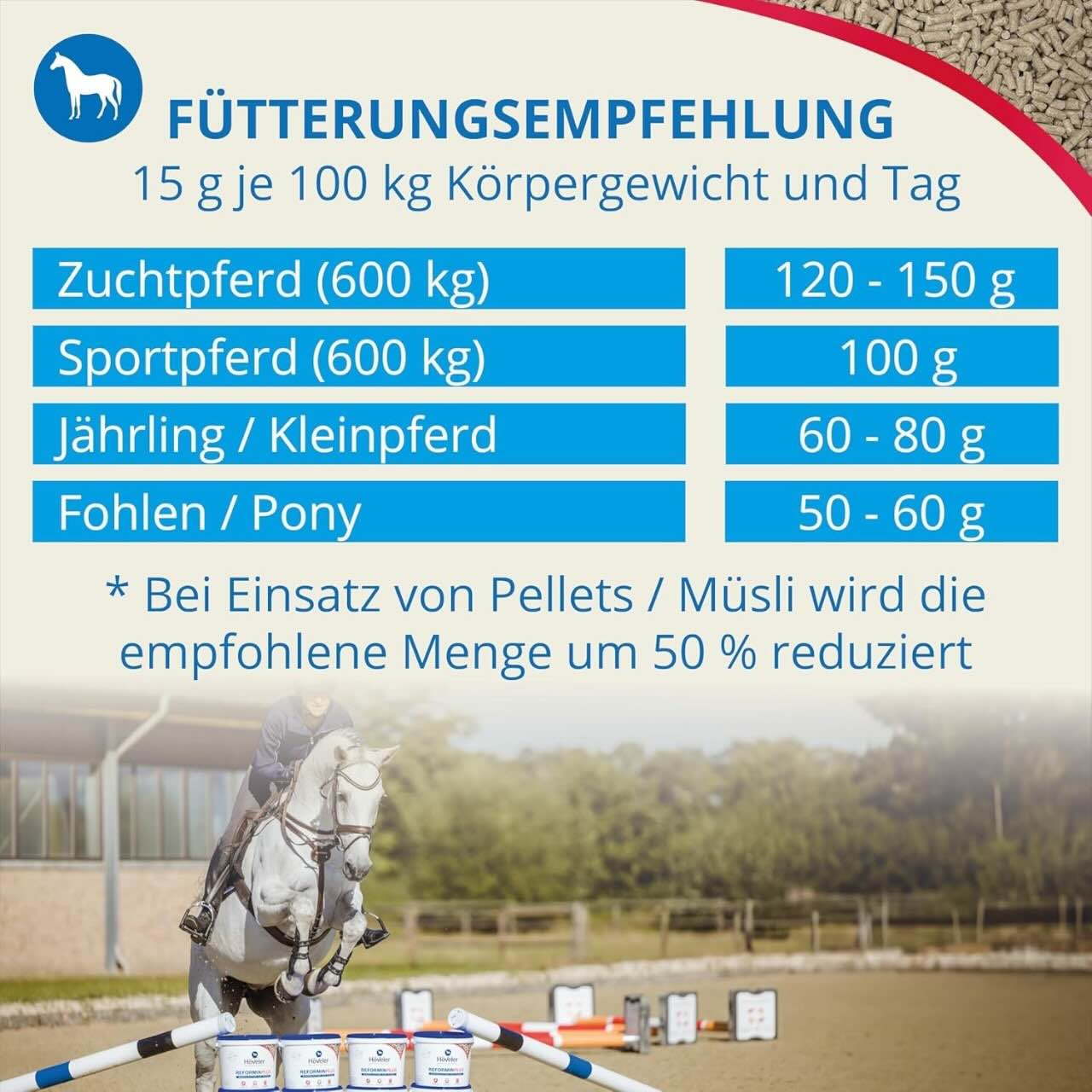 Die Fütterungsempfehlung richtet sich nach dem Lebendgewicht des Pferdes. Sportpferde erhalten etwa 100 g, während Zuchtpferde zwischen 120 g und 150 g benötigen. Jährlinge und Kleinpferde sollten mit 60 g bis 80 g versorgt werden. Fohlen und Ponys profitieren von einer Dosis zwischen 50 g und 60 g. Frisches Trinkwasser sollte stets zugänglich sein.