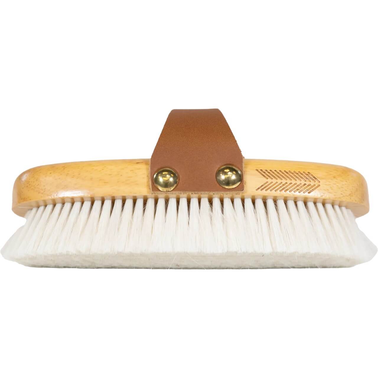 Die natürliche Farbgebung und das hochwertige Holz verleihen der Glanzbürste Overall Brush Soft Bürste ein zeitloses Aussehen. Der ergonomisch geformte Griff sorgt für eine angenehme Handhabung, während die weichen Borsten aus Ziegenhaar selbst die empfindlichste Pferdehaut sanft pflegen.