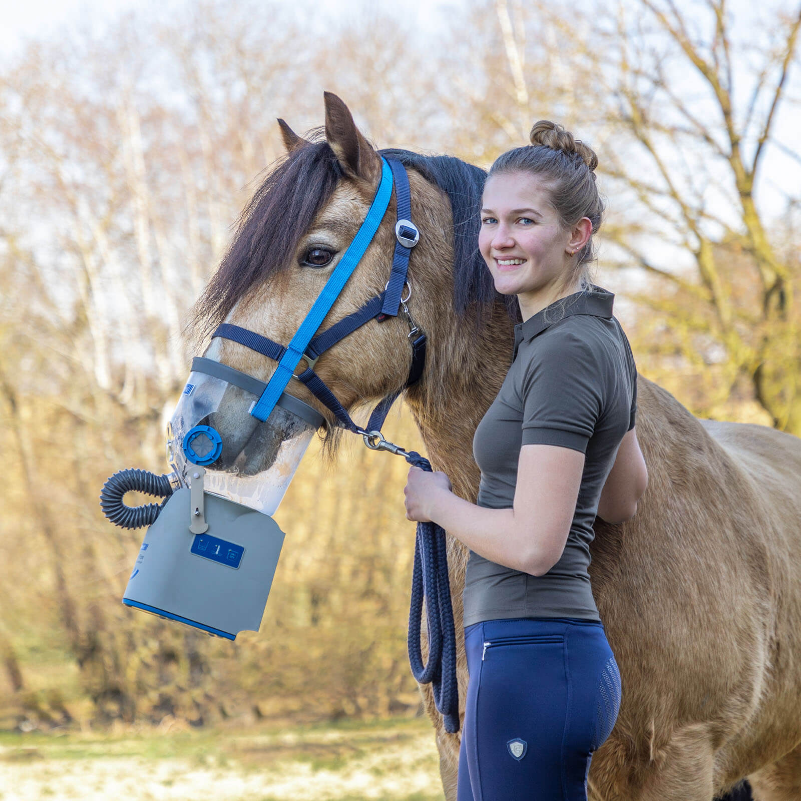 Die Maske wird einfach auf den AirOne Flex Inhalator aufgesetzt und am Pferd befestigt. Sie ermöglicht eine gezielte Inhalation, die je nach Bedarf angepasst werden kann. Ideal für den täglichen Einsatz im Stall oder auf der Weide.