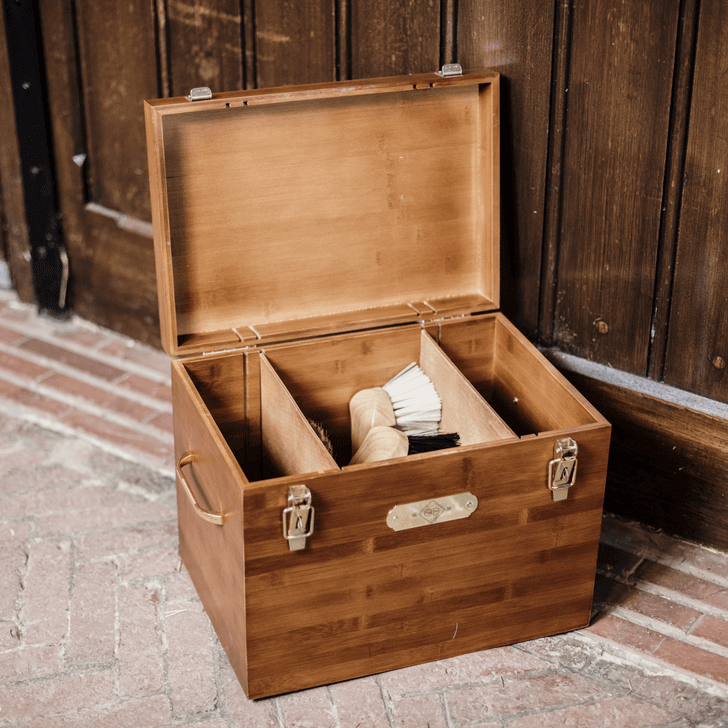 Die Tack Box kombiniert zeitloses Design mit praktischen Vorzügen. Gefertigt aus hochwertigem Bambus, bietet sie eine natürliche Ästhetik und eine langlebige Struktur. Die goldenen Schnappverschlüsse und Griffe geben ihr einen Hauch von Luxus und machen sie zu einem echten Hingucker in deinem Stall.