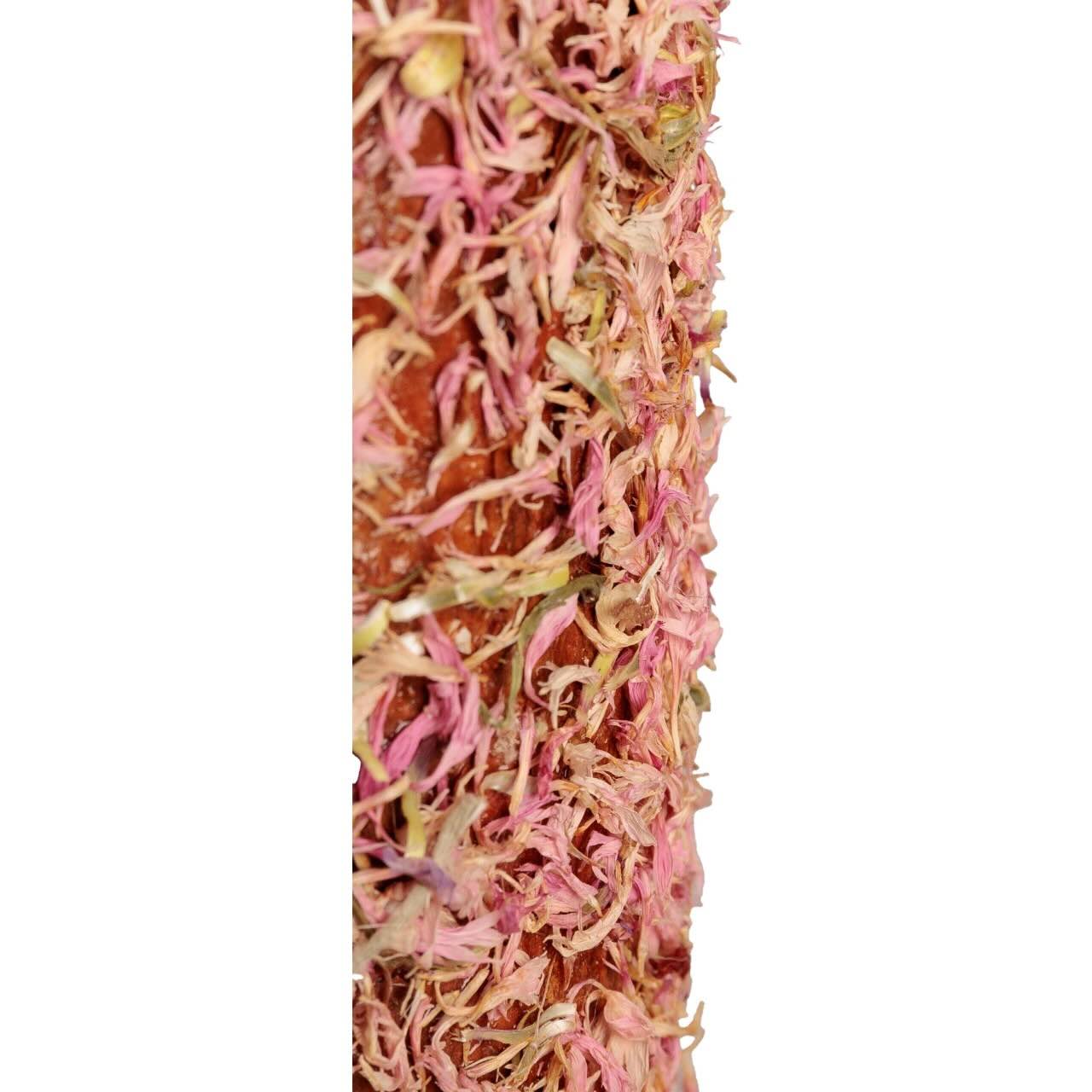 - Das rosafarbene Stück enthält rosa Kornblume, geschätzt für ihre beruhigende, antioxidative, entzündungshemmende und entgiftende Wirkung.