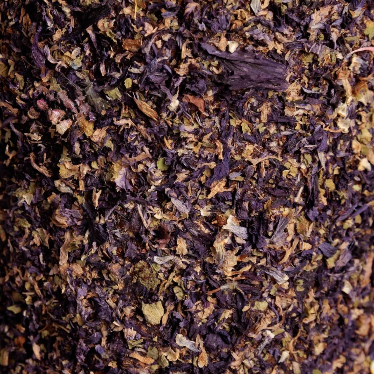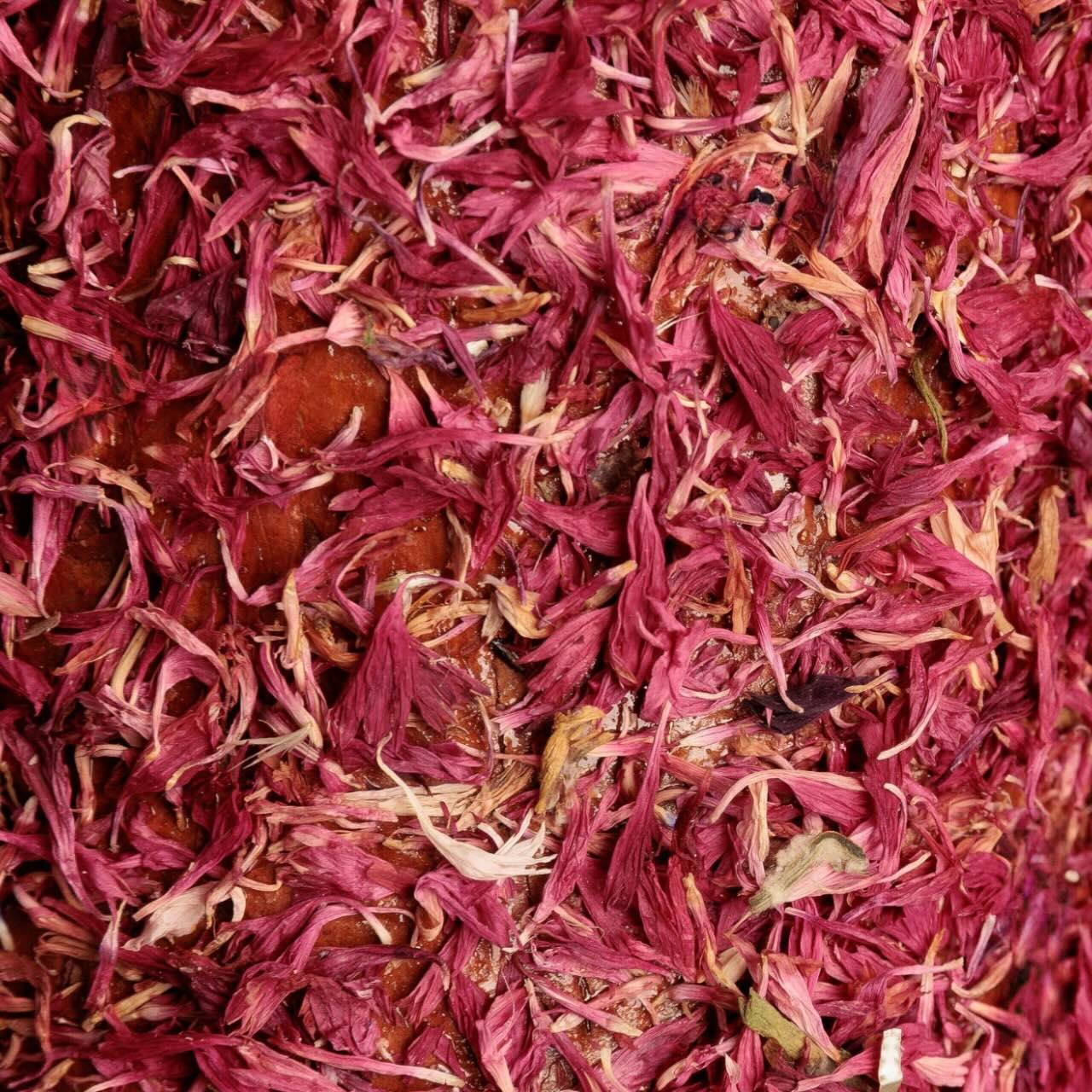 - Das lila Stück enthält rote Kornblume, die für ihre Unterstützung der Verdauung, entspannende Wirkung und ihren hohen Gehalt an Antioxidantien bekannt ist.
